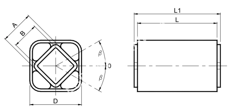 Упругий элемент VIB Type AR-T 50 х 60, аналог ROSTA DR-S 38х60 работает в угловом диапазоне +/-30°Материал исполнения внешнего корпуса и внутренней трубы квадратного сечения -сталь.